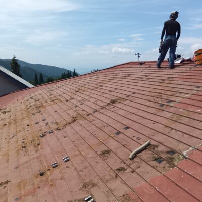 これから既存の屋根材をはがして、フッ素鋼板で仕上げます。