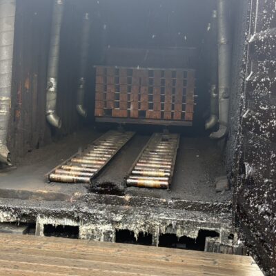 続いてはコンテナを独自に改造したドライランバー(コンテナ乾燥機)扉には主に松から流れるヤニがびっしりと張り付いていました。