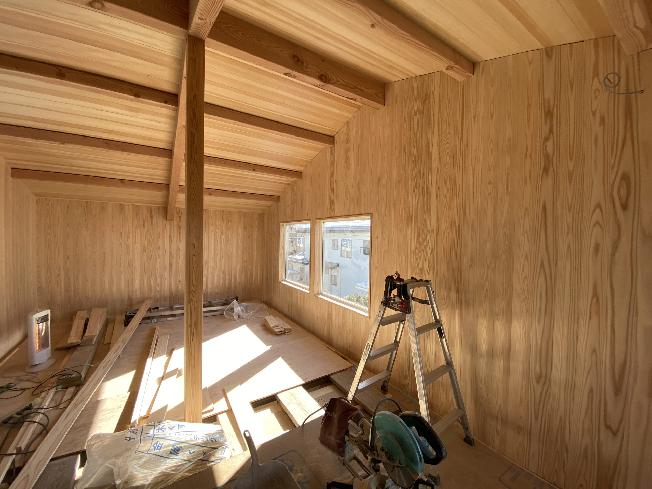 今回は、久しぶりに吹抜け全ての壁に板張りを採用していただきました。