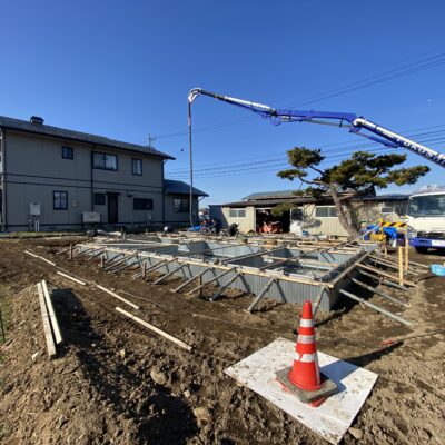 先週末はキソ現場二棟同時にコンクリートの打設&写真奥に見える