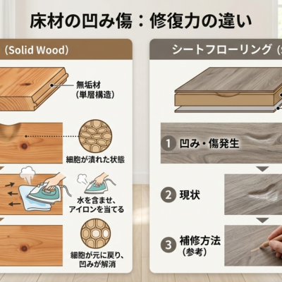 確かに、無垢材(特にスギやヒノキなどの針葉樹)は素材が柔らかいため、強い荷重がかかればシートフローリングよりも凹み傷はつきやすいかもしれません。
